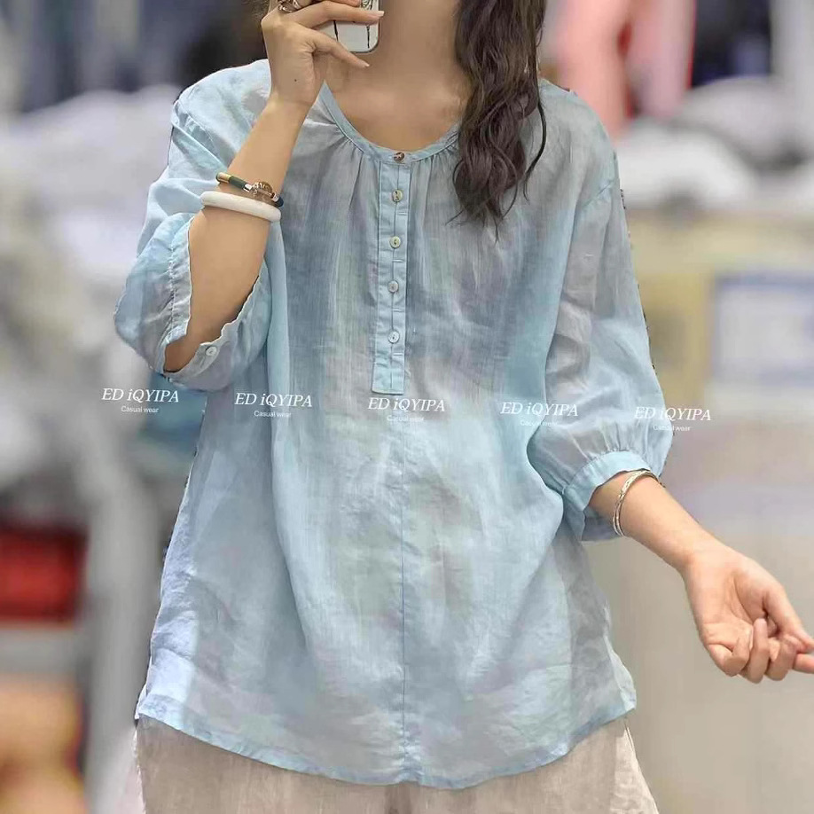 Ed906綿麻丸襟ゆるい純色シンプルなカーディガンtシャツ女性2025夏カジュアルシャツ夏服
