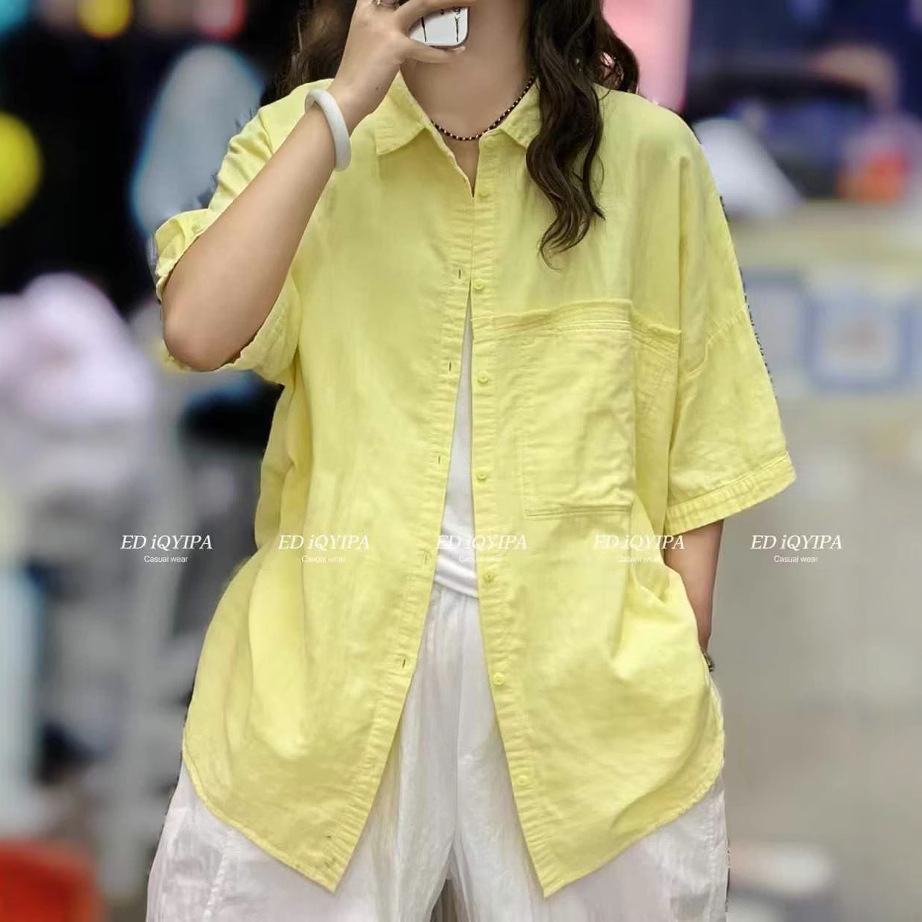 Ed113500綿麻のゆったりした大きいサイズの気質は肉を遮ってやせている半袖のシャツの新商品を隠して襟の純色のカーディガンの上着を返します。