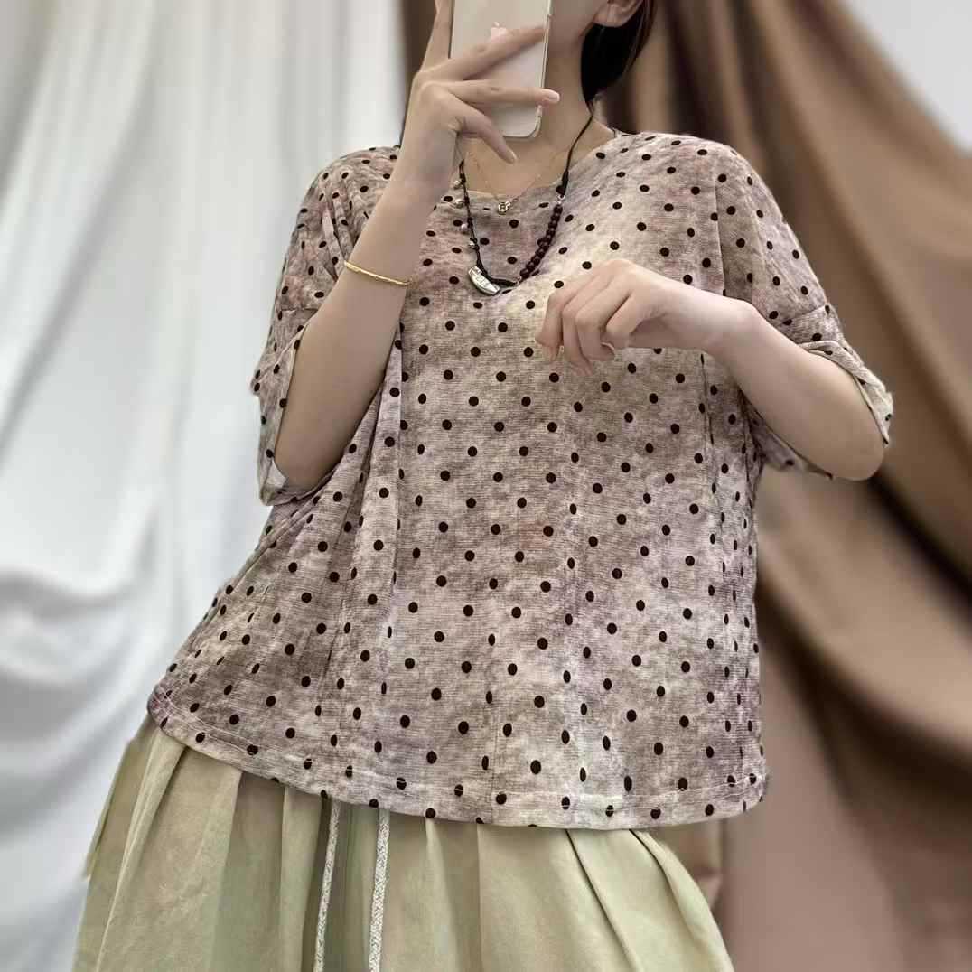 Dm3277復古文芸波点プリントゆるい半袖tシャツ夏の新型遮肉が痩せている上着の女性