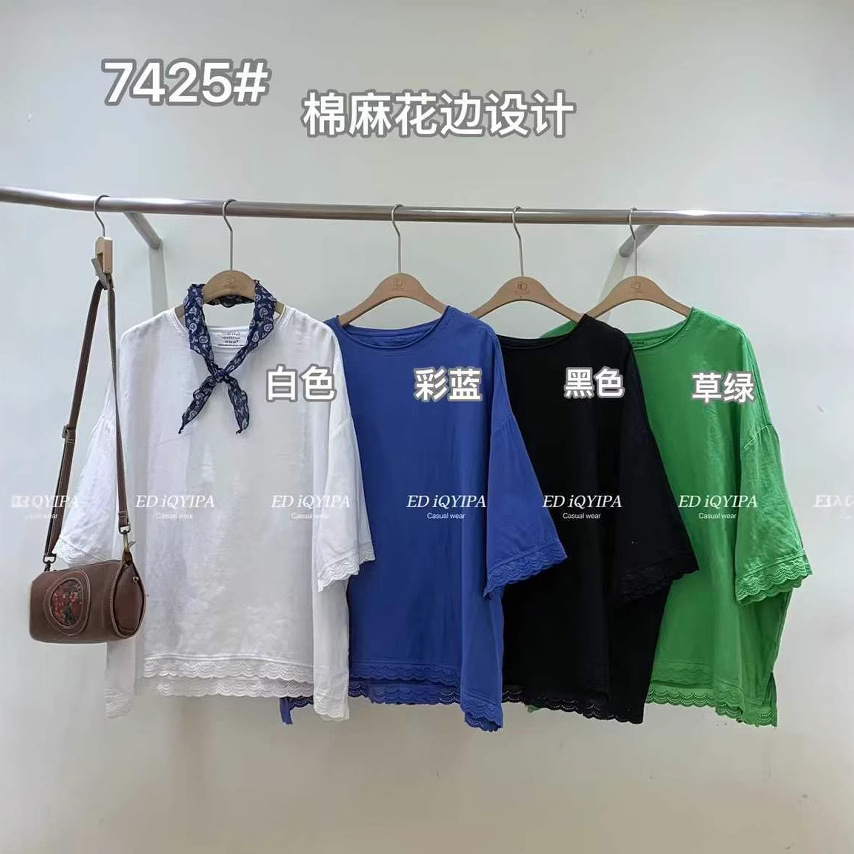 Ed7425綿麻レースデザイン丸首ゆるい肉隠れ痩せ半袖tシャツ夏の新型プルオーバーシャツ