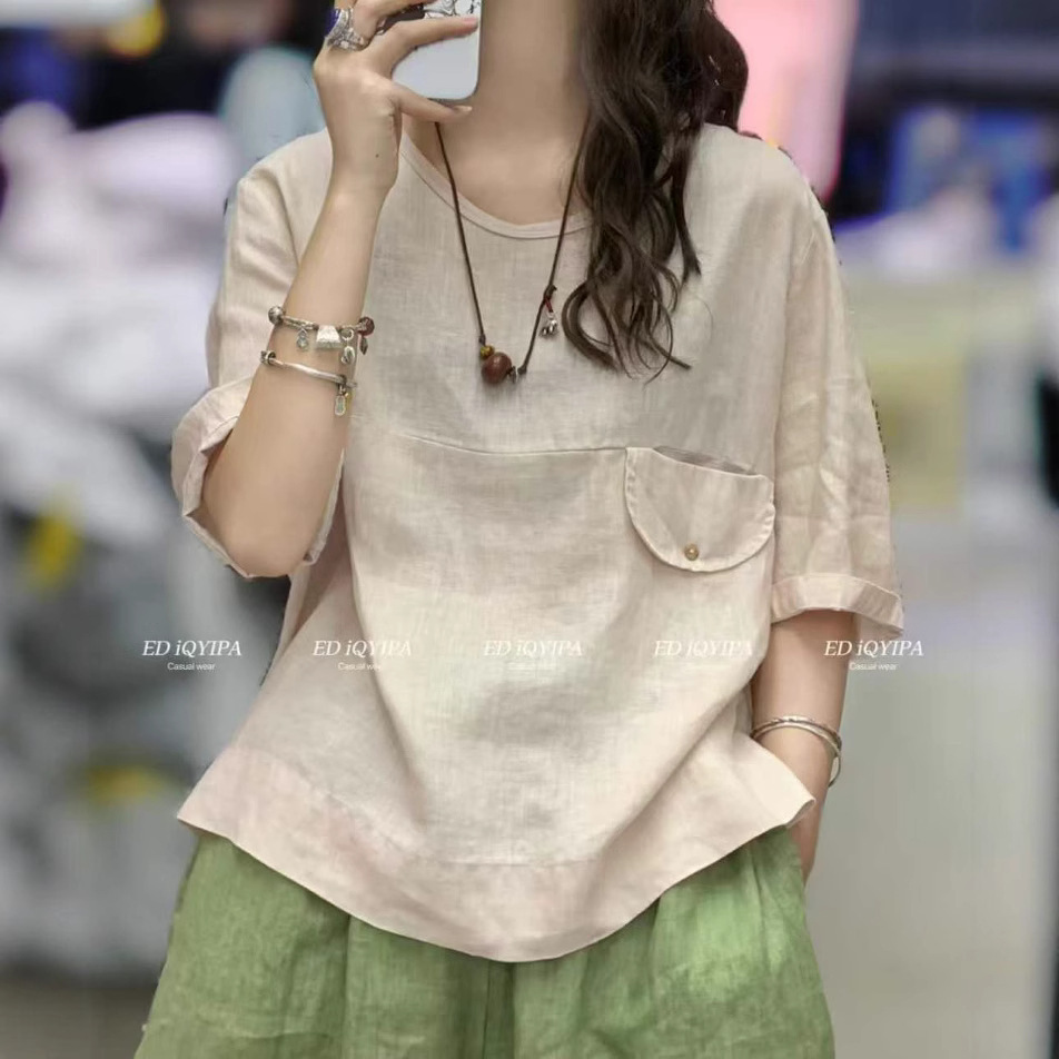 Ed7450 # 100% 純ラミー麻丸襟通気快適中袖tシャツ夏新商品純色百合カジュアル上着