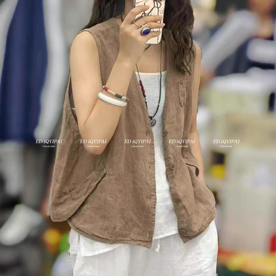 Ed113749純亜麻の短いvネック馬甲2025新型のゆったりした大きいサイズのデザインのカジュアルコートの上着