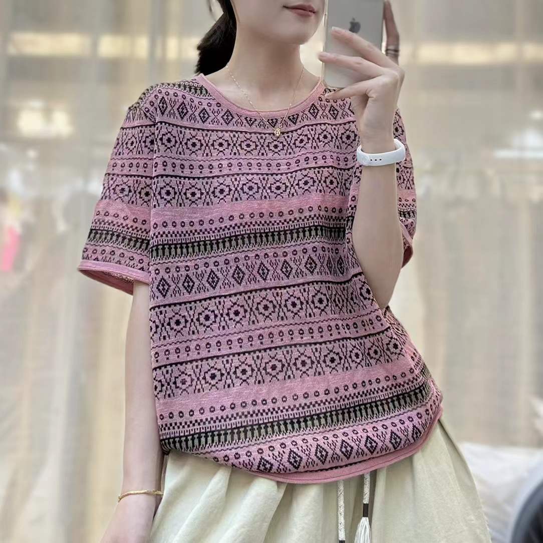 dm9066 レトロジャカードニット半袖 tシャツ女性のための 2025 夏の新しいラウンドネックルーズ痩身多用途トップ