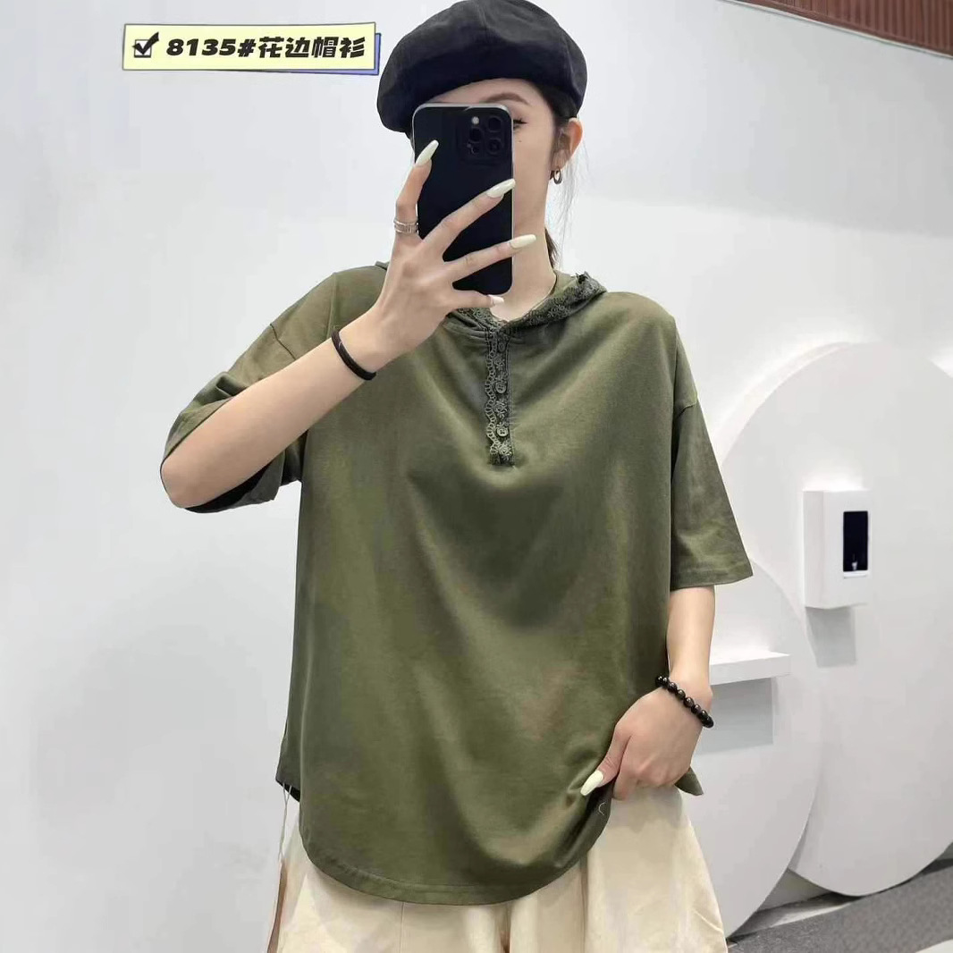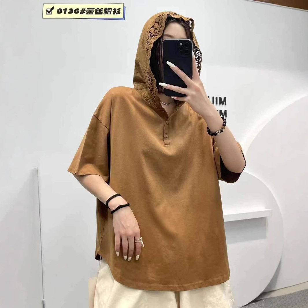 yl8135 純綿フード付きルーズビッグバージョン半袖レースパーカー 2025 夏の新文学無地 Tシャツ女性のための