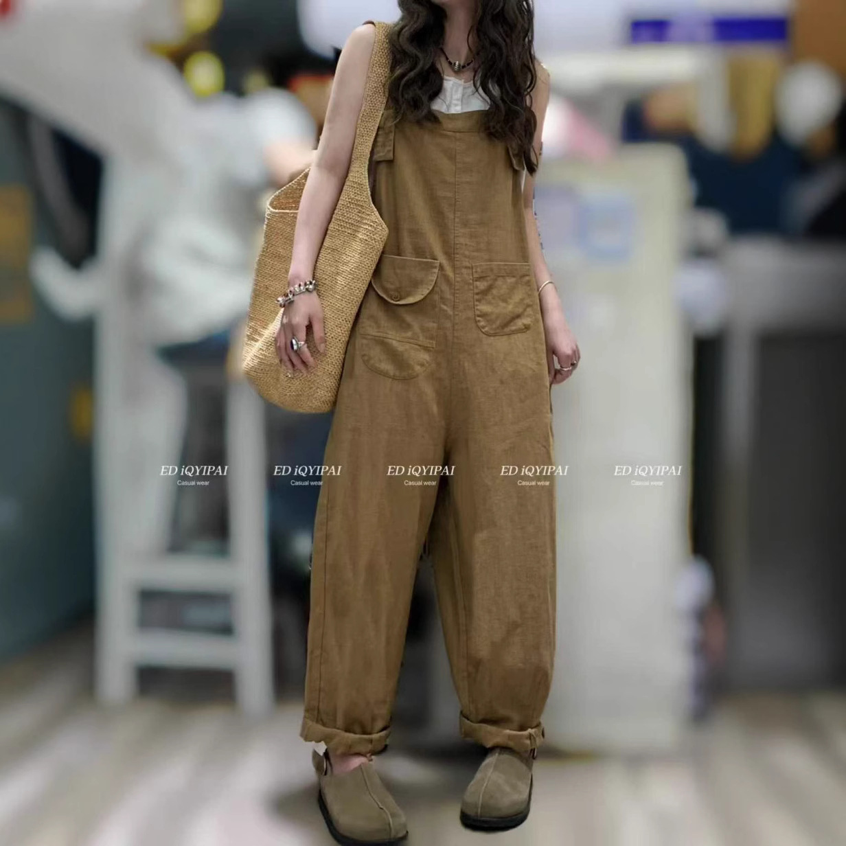 ed9539 文学レトロリネンコットンオーバーオール 2025 新しいルーズカジュアル無地デザインオーバーオール女性の服