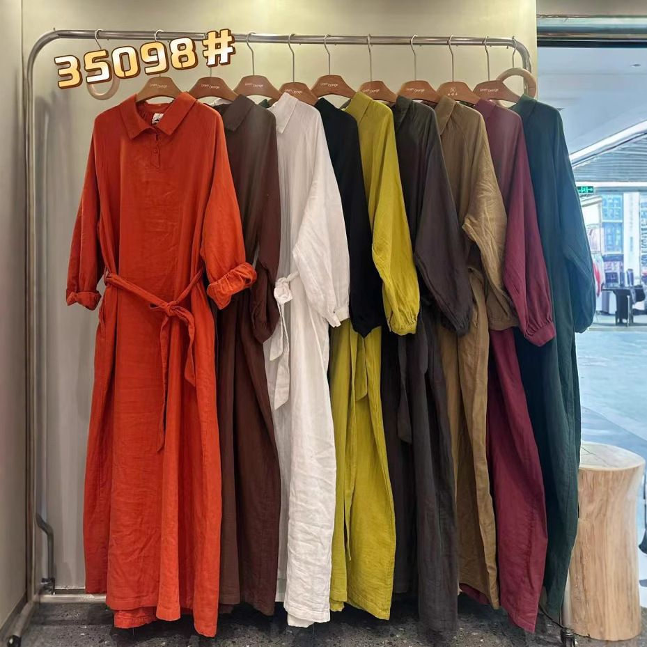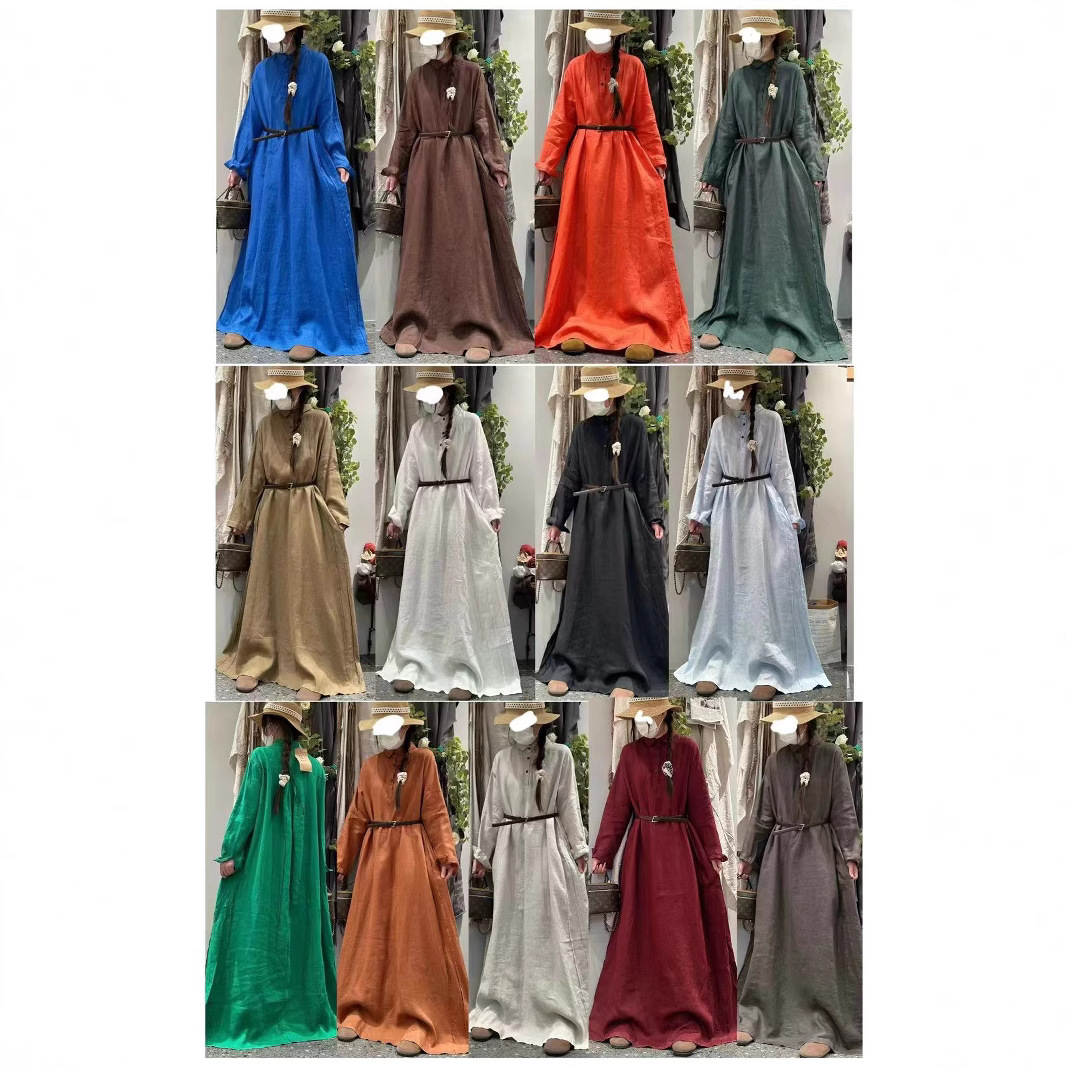 cz8931 ラペル無地リネンルーズレトロ文学ロングスカート 2025 気質カバー痩身長袖ドレス