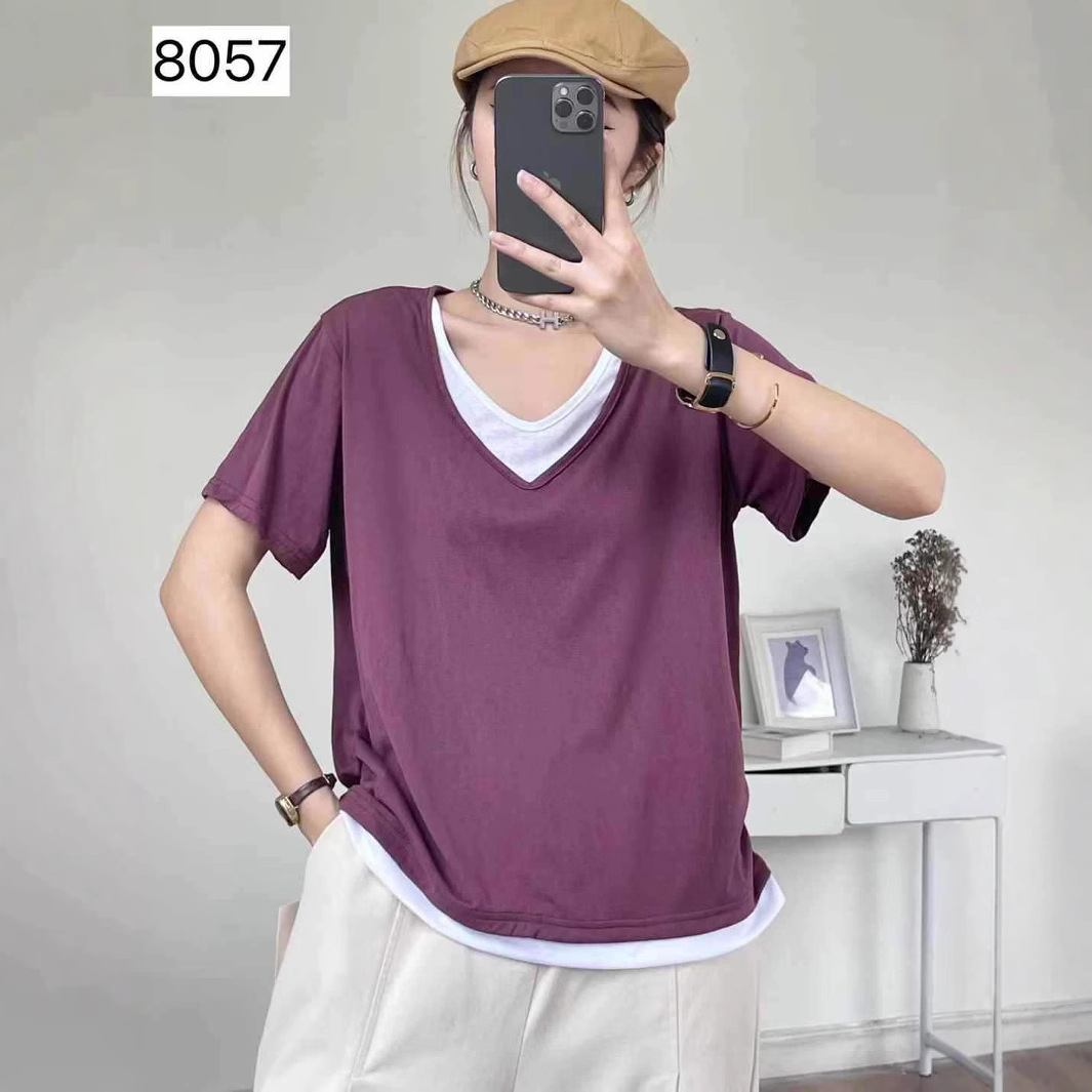 yl8057 偽ツーピース V ネック半袖 Tシャツ女性の夏のルーズ痩身薄いお腹カバー半袖 Tシャツトップ新しい