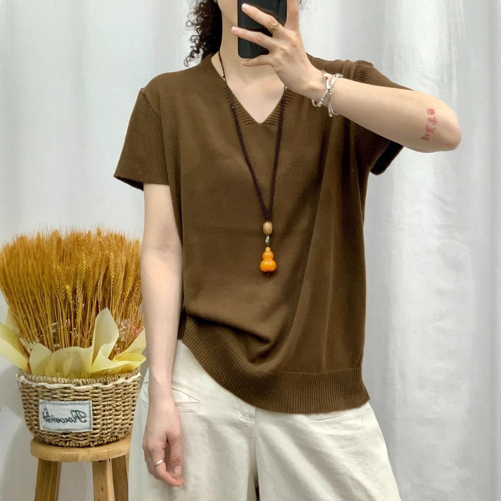 yy09A 韓国無地 V ネック気質リネンニット半袖 T シャツ夏の新しいレトロな怠惰なカジュアルベース