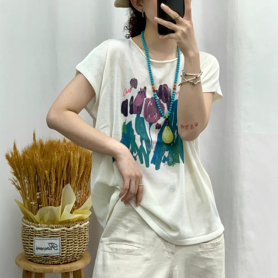 Yy 2526丸首レトロリネンプリントtシャツ女性2025夏の新商品