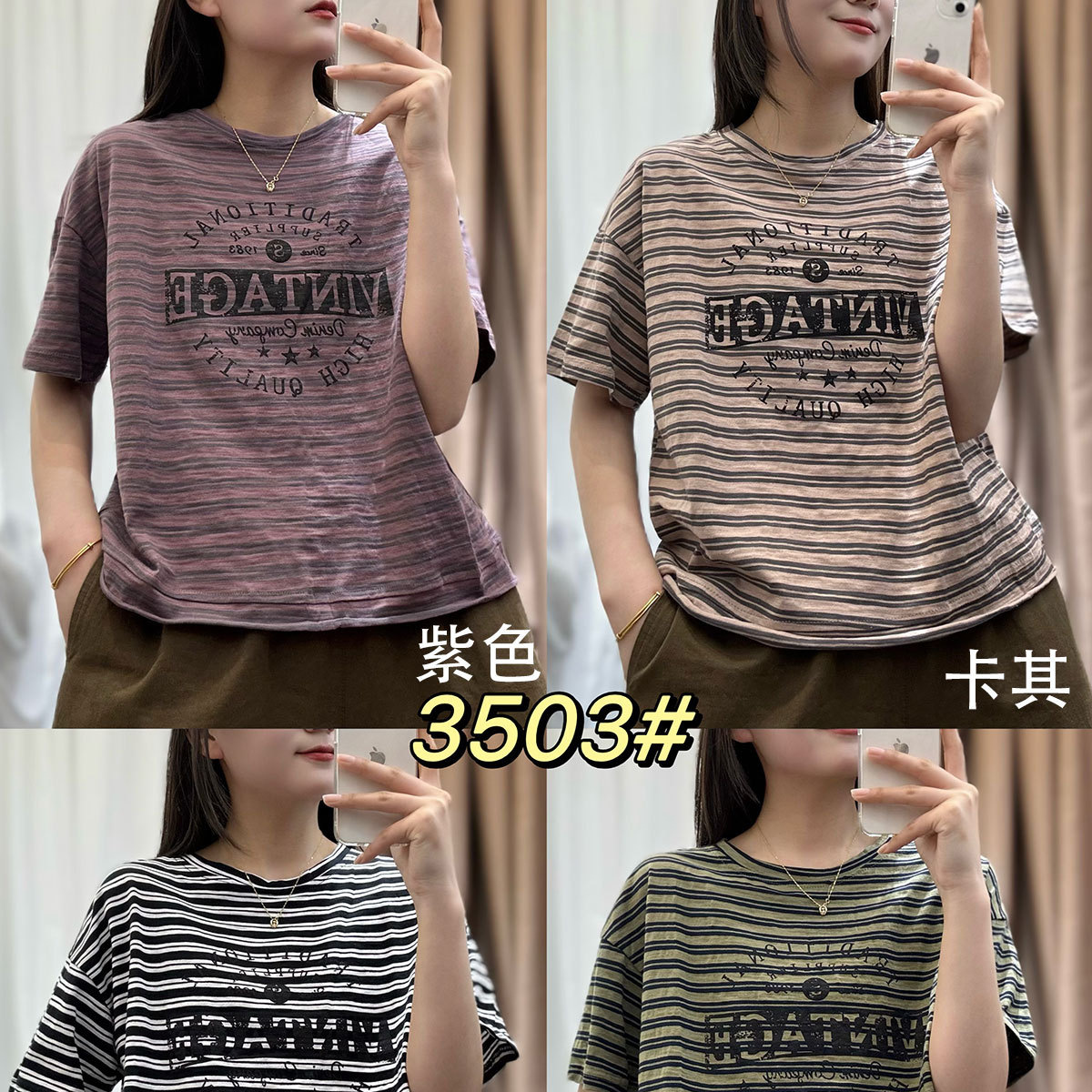 Dm3503竹節綿丸襟ストライプのゆったりした半袖tシャツ夏の新型の肉を隠して痩せているカバーの頭を覆う上着