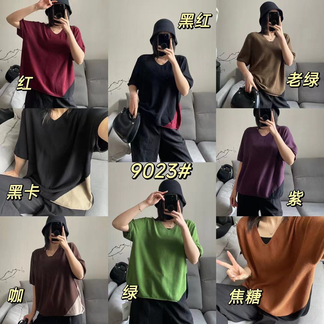 Dm9023文芸vネックのつなぎ合わせの色のデザインのファッションの柔らかいモチとしたニットtシャツのカジュアルな半袖の上着の女性