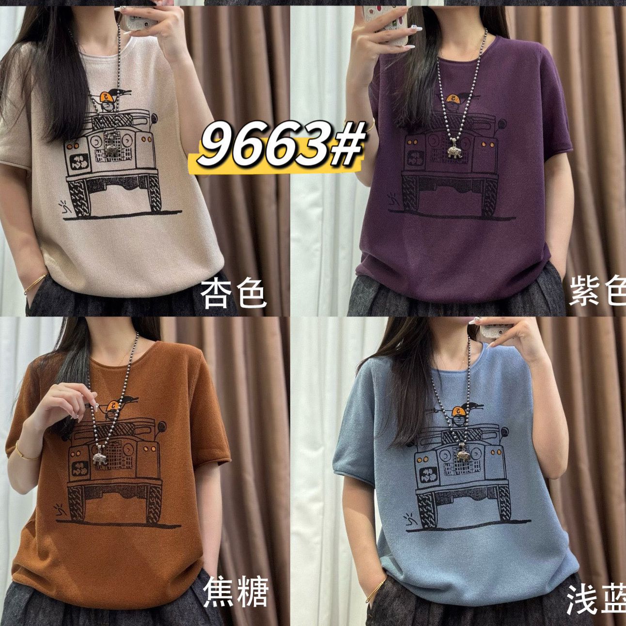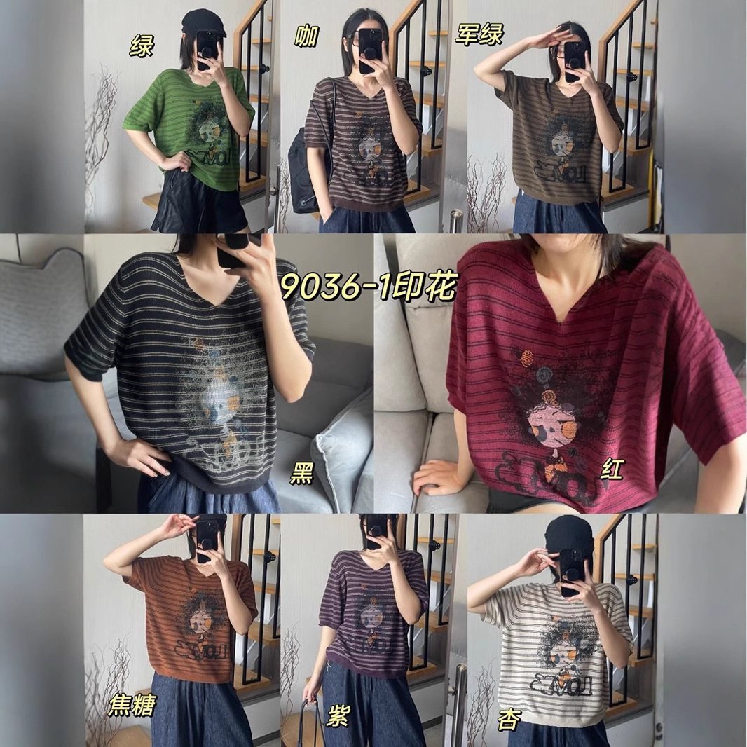 Dm9663丸襟ゆるいファッションプリント柄半袖tシャツ2025新型文芸純色ニット
