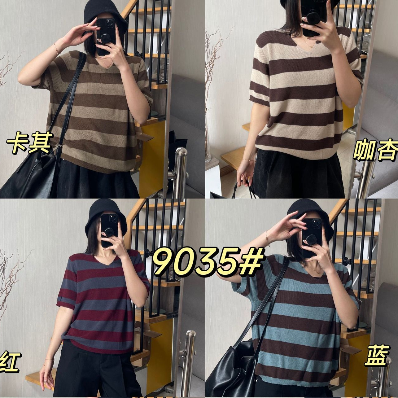 Dm9035V襟ストライプニット半袖tシャツ女性2025夏の新型洋気ファッション薄いニットシャツ