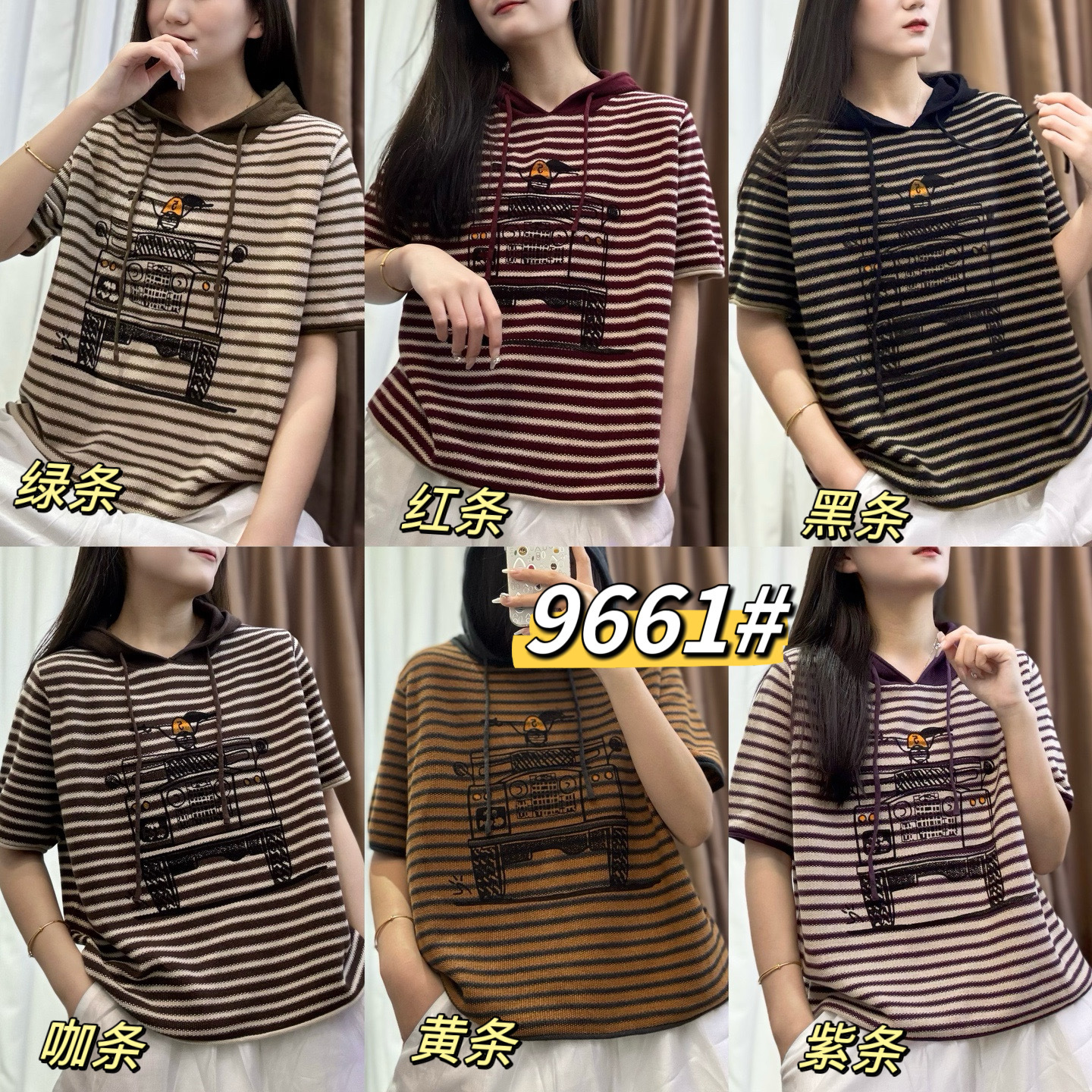 Dm9661文芸つなぎ帽子縞模様プリント半袖ニットtシャツ新商品ファッション気質シャツ