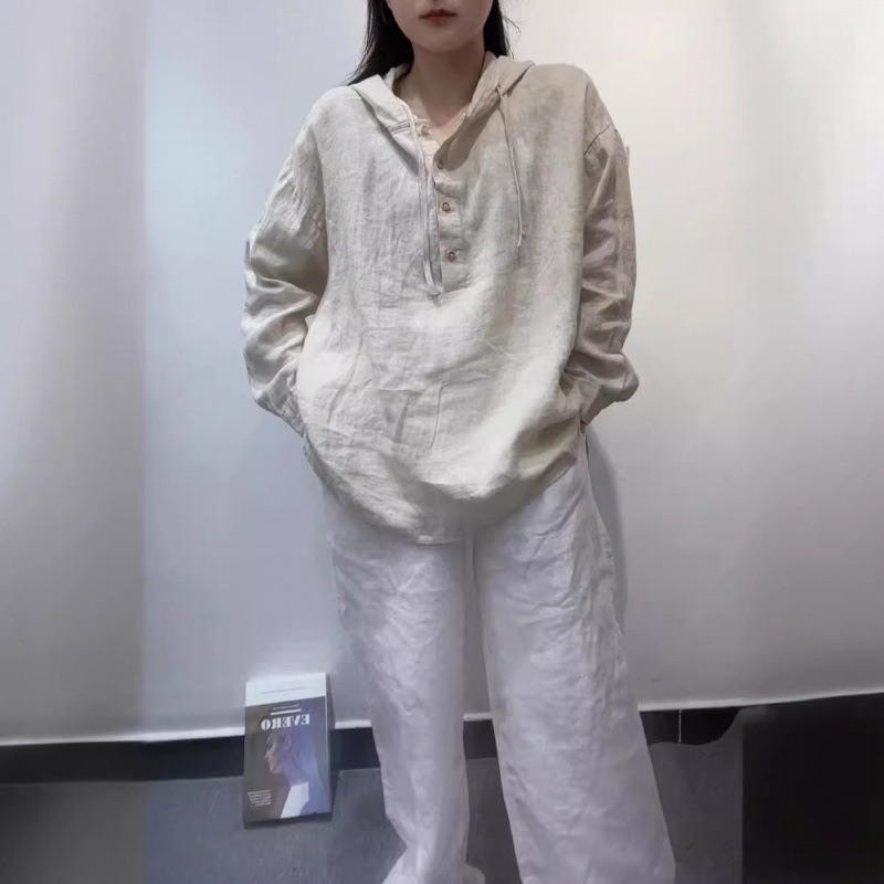 Mx8511亜麻純色フード付きシンプルなカジュアル長袖tシャツ女性2024春夏新作文芸カバー