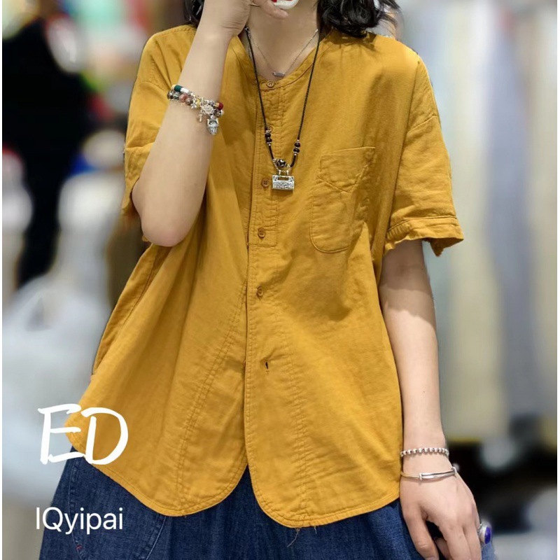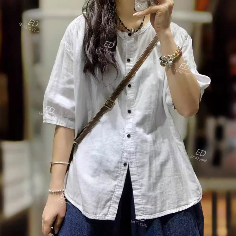 Ed03718韓国版綿麻丸襟半袖tシャツ文芸カジュアル打底2024夏シャツtシャツ上着女