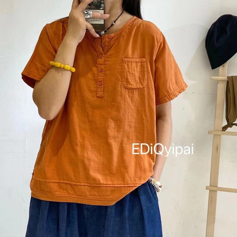 Ediqyipai #8866綿麻丸襟半袖tシャツ2024夏新商品ゆるいカジュアル純色tシャツ女夏