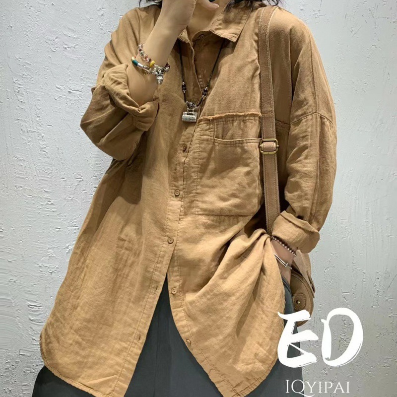 Ed3500二重綿麻の後ろの毛の縁のデザインのゆったりした大きい版のシャツの2024の新型の復古の百合のシャツの女性