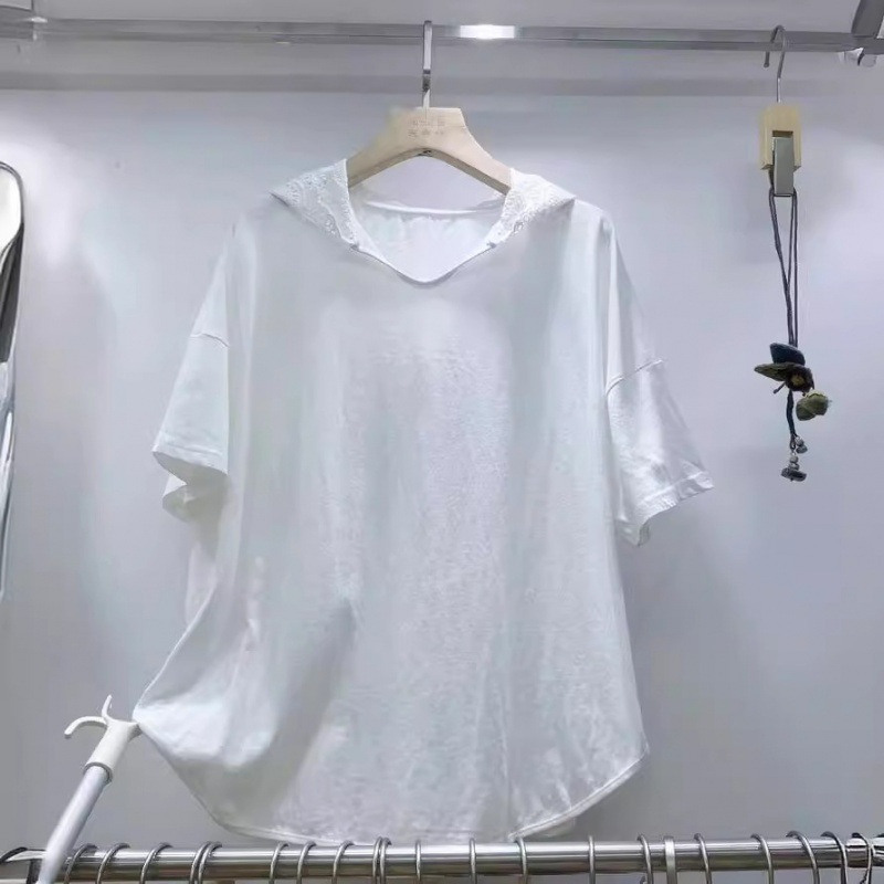 Fm 00393純綿の帽子付きのゆったりした大バージョンの半袖刺繍の帽子のシャツ