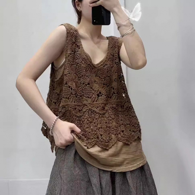 Ed7155韓国輸入洗水綿vネックゆったりとしたつなぎ合わせ馬甲2024新型の外に痩せた馬のクリップが見える
