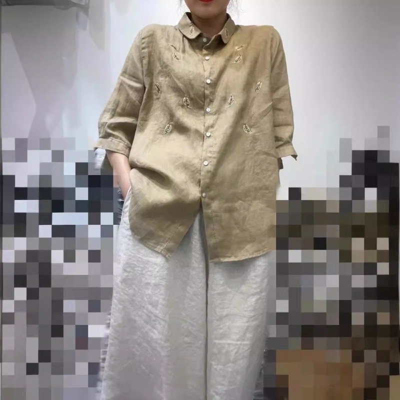 Mx8345亜麻のゆったりとした刺繍のカジュアルな百合七分袖のシャツ
