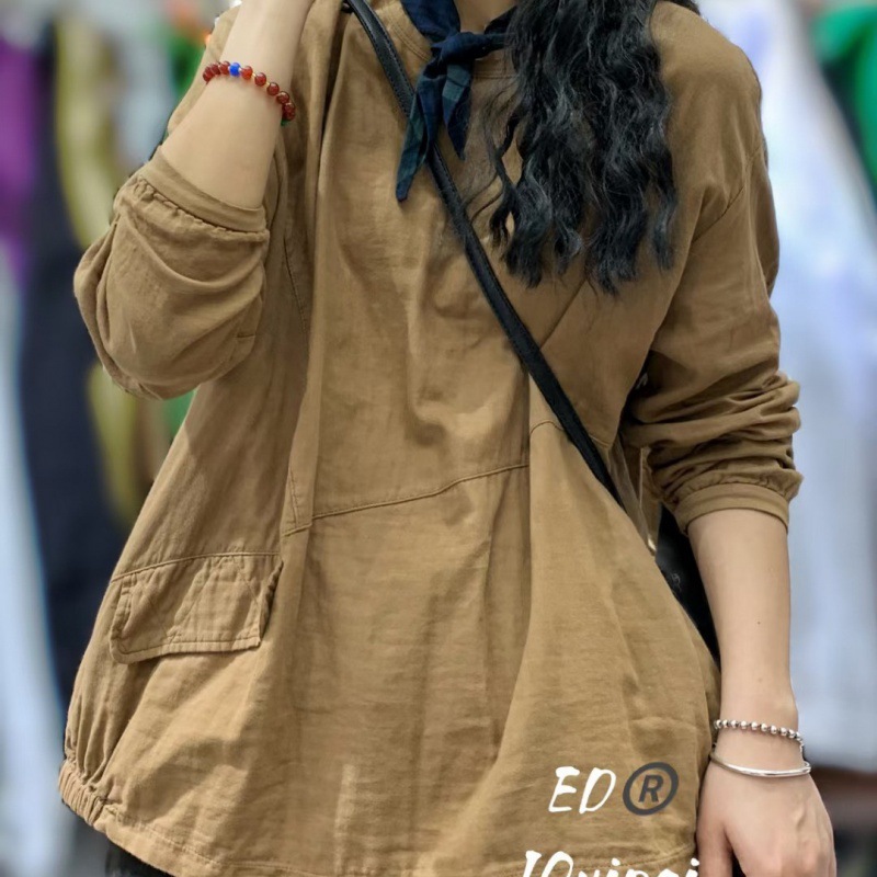 Ed3783ダブル綿丸首ゆるい長袖tシャツ2024春新作カジュアルレトロなシャツ女