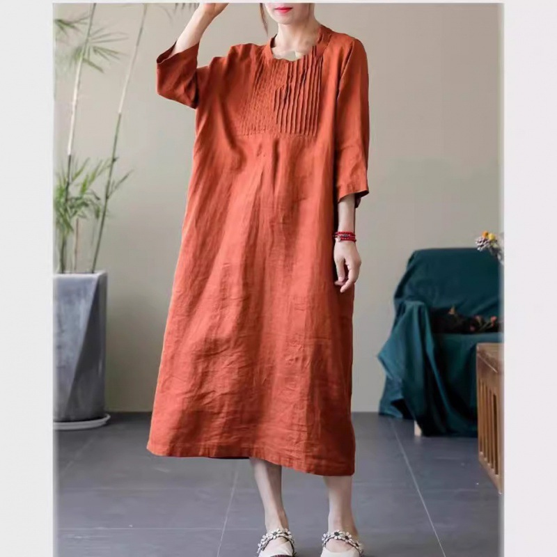 丸首ファッション亜麻ゆるい七分袖ワンピース女性2024新純色文芸気質ワンピース夏服