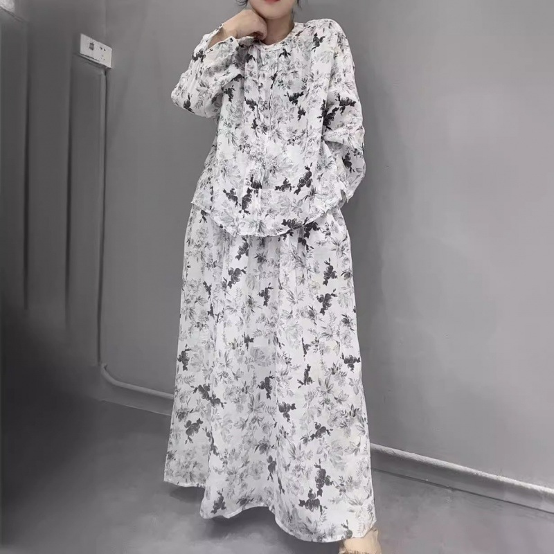 Mx8528プリントのゆったりとしたレトロなファッションは長袖シャツセット2024の新しい丸襟リネン2点セットです