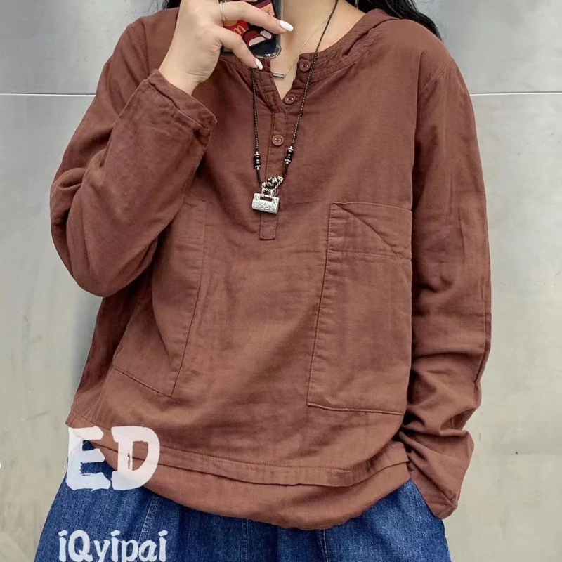 Ed8300綿韓国版綿麻連帽tシャツ2024新型ゆるいカジュアル文芸大ポケットが女性の上着をつなぎ合わせる