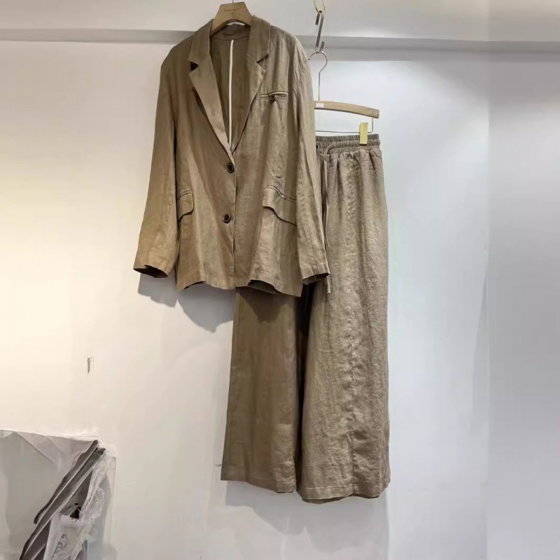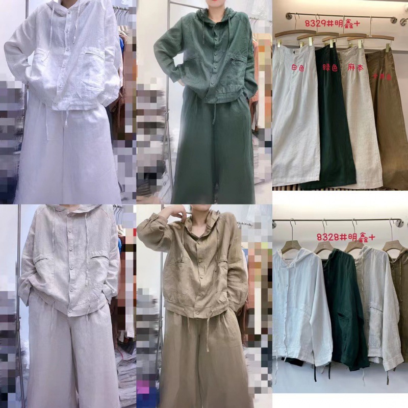 Mx8328亜麻の新型セットと帽子の上着の亜麻のワイドレギンスのスーツの女性のゆったりした純色の亜麻のスーツの女性