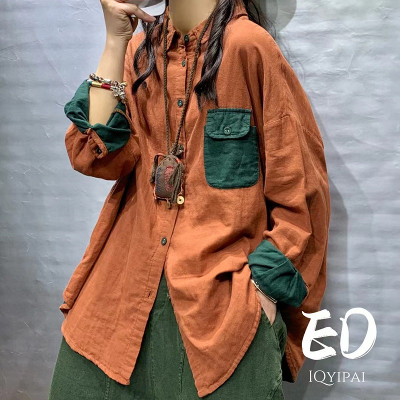 Ed7212綿麻材衝突色デザインのゆったりした長袖シャツ女性2024春の新しい文芸シャツ