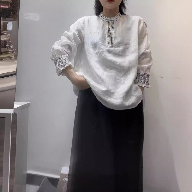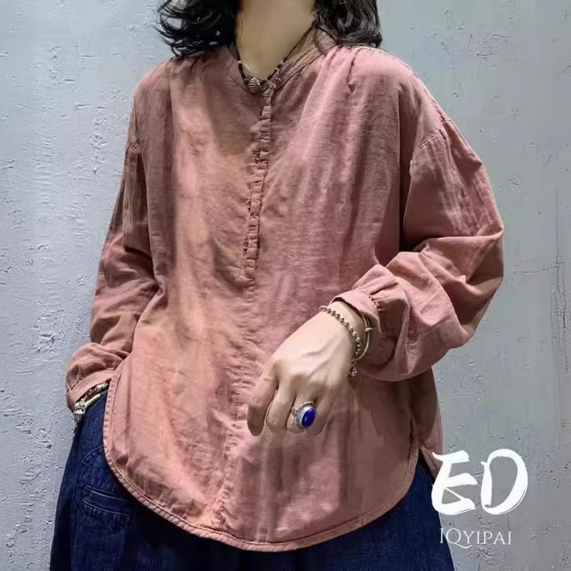 Mx8513文芸レトロ亜麻のゆったりとした長袖のシャツの女性2024春夏の丸襟の頭の底のシャツのファッション