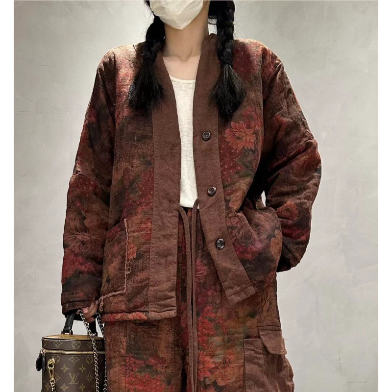Cz9967 9966プリントコットンのゆったりしたカーディガンのコート綿のカジュアルなズボン2024の新型のレトロな外付けの女性