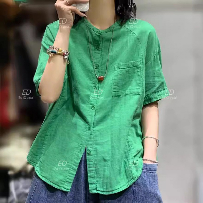 Ed3578双糸綿麻生地カーディガン半袖tシャツ2024夏新商品カジュアル百合ゆるいシャツ女
