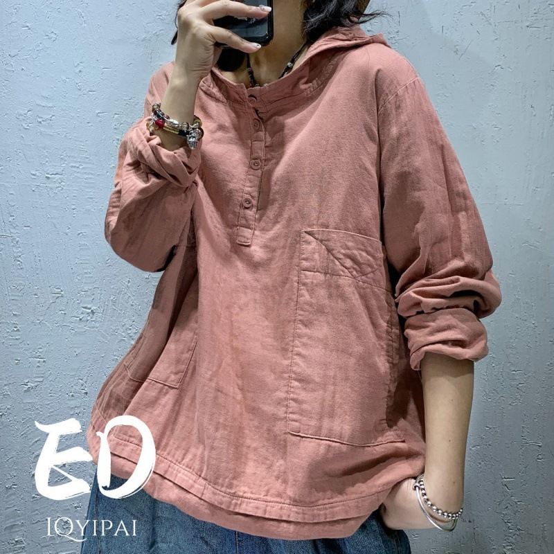 Ed8300綿麻連帽長袖tシャツ女性2024春の新しいゆるい底カジュアルな単色の上着