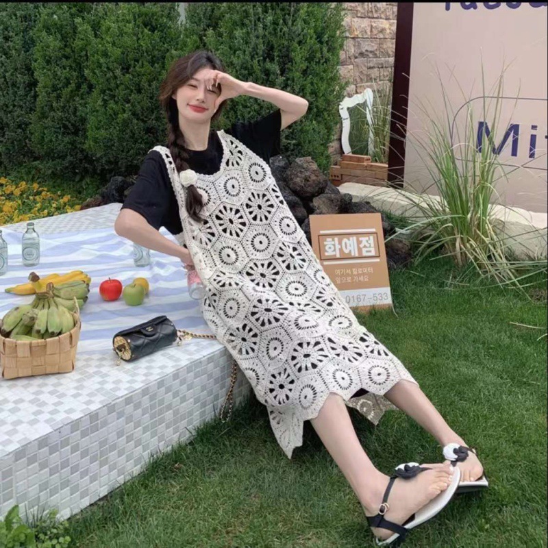Fm0213-2純色vネックファッション気質透かし彫りカジュアル百合ワンピース2024夏外着ベストスカート