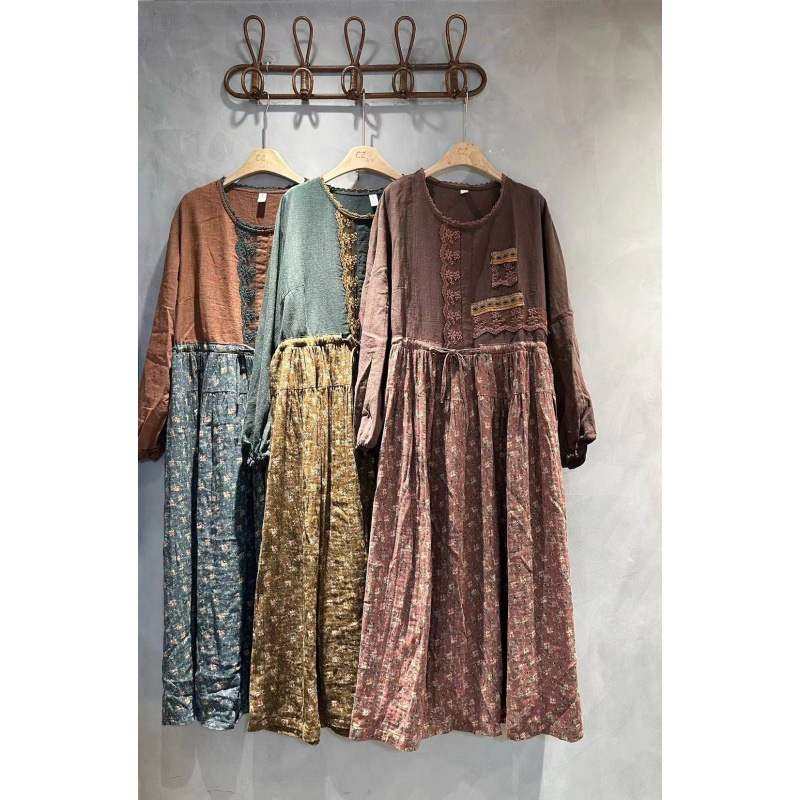 Cz25196花綿麻丸襟シンプルでゆるいワンピース2024春文芸復古ワンピース女性
