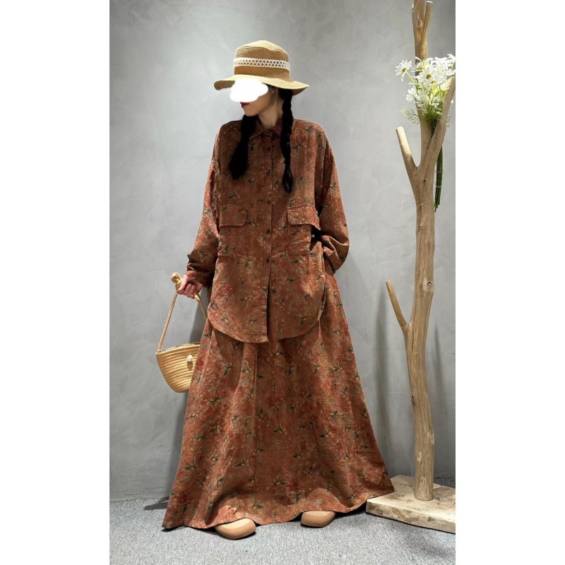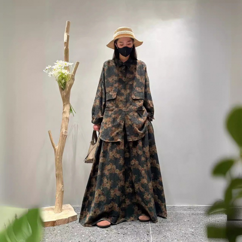 Cz89509 9975綿麻プリントのゆったりとした雰囲気のカジュアルスーツ2024新型文芸百合シャツのハーフスカート