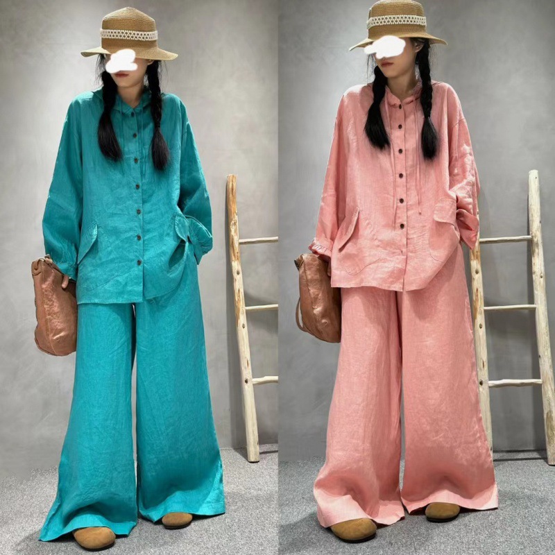 Cz35018 36002綿麻ファッション百合シンプルカジュアルシャツセット2024新型着痩せ2点セット