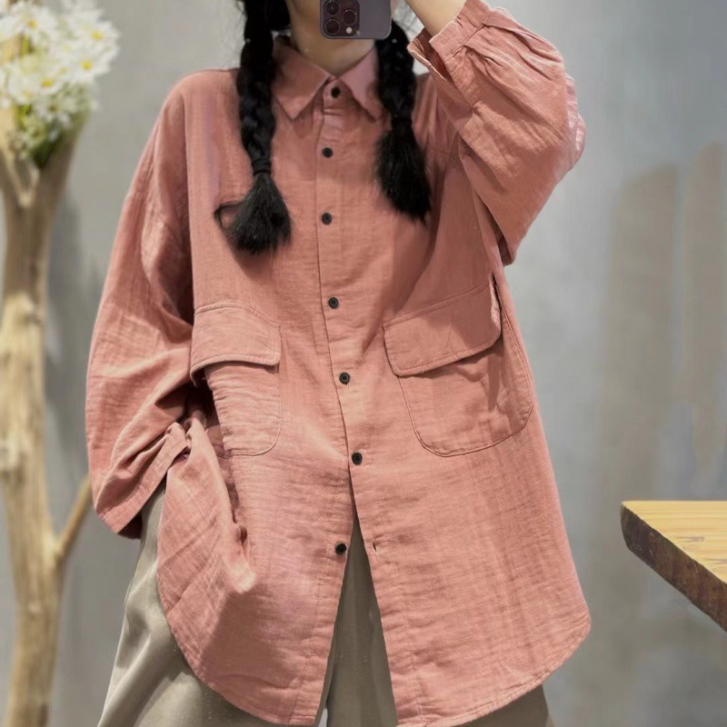 Cz35008綿麻の純色はゆったりとした大きいサイズの長袖のシャツをつなぎ合わせます。