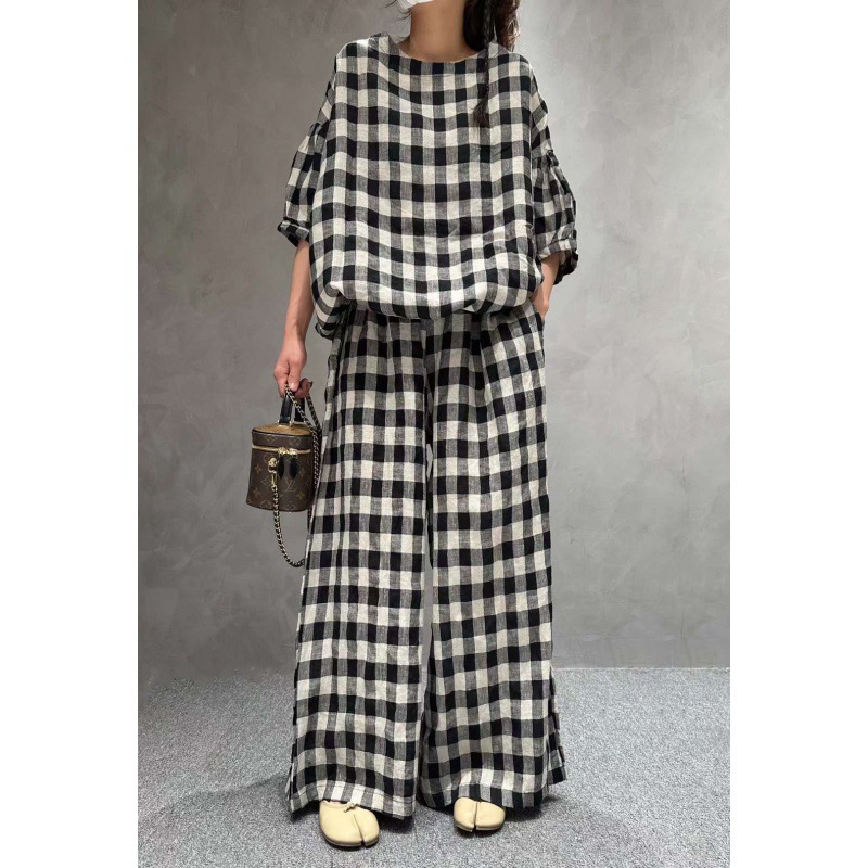 Cz9370gzラウンドネックファッション百合接合格子亜麻セット2024新型気質2点セットカジュアルパンツ