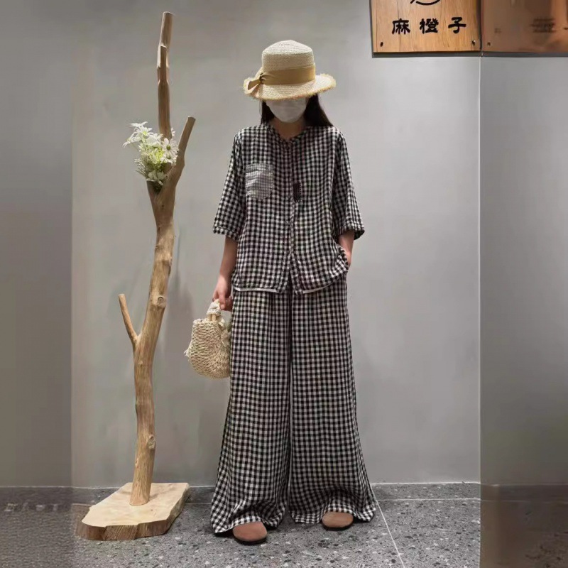 Cz9171 8996文芸中袖亜麻格子セット女性春夏新作亜麻tシャツウエストワイドパンツ