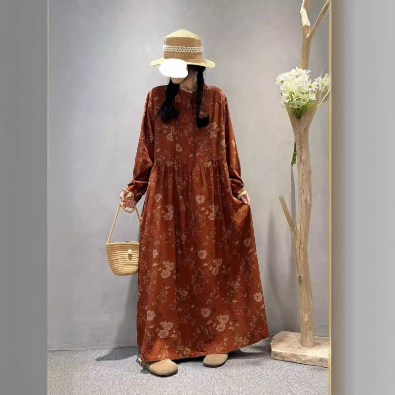 Cz25196花綿麻丸襟シンプルでゆるいワンピース2024春文芸復古ワンピース女性