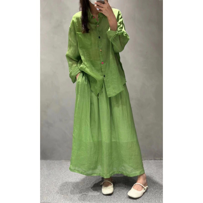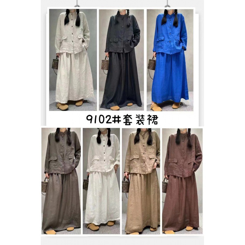 Cz2024夏の新しい女性の丸首の日本のゆったりしたシャツはシャツのカジュアルなタイプのスカートのスーツの亜麻の大衆を合わせます。