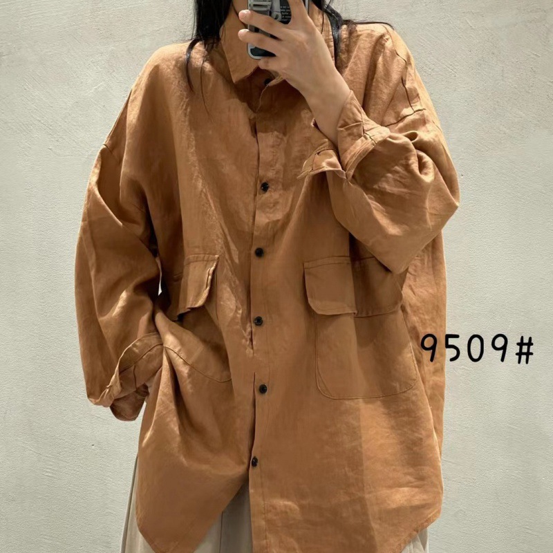 Cz9509亜麻のゆったりした大きい版のファッションの百合のカーディガンのシャツの2024の新型の文芸のカジュアルな上着の女性
