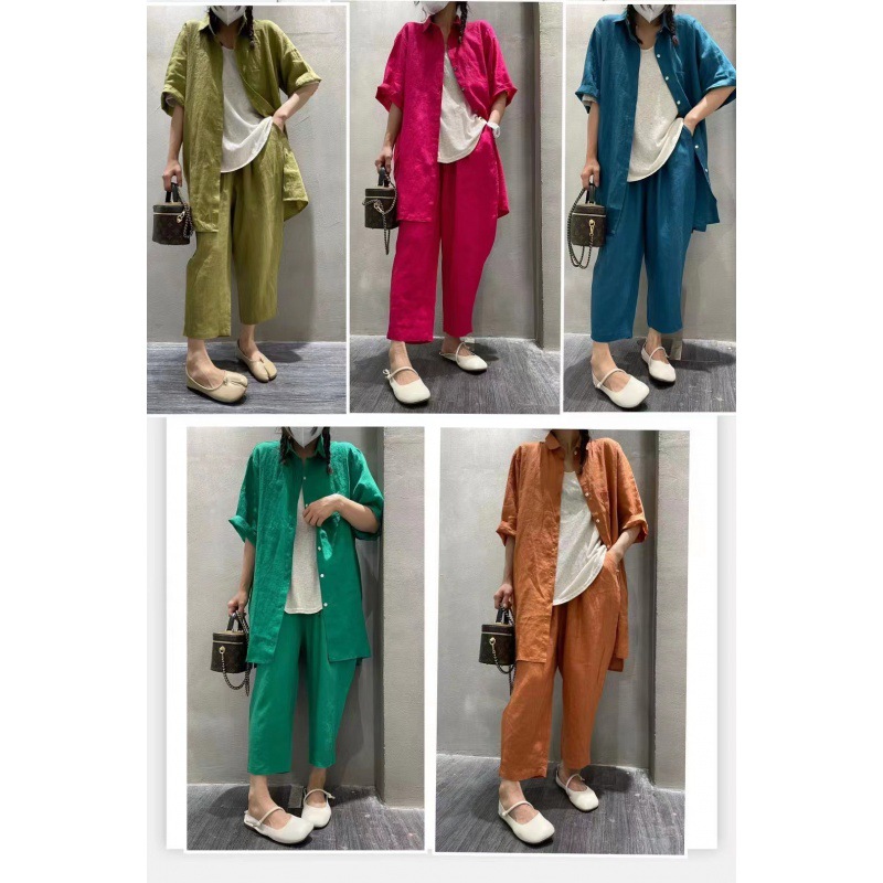 Cz9388 9168亜麻純色スーツシャツカジュアルパンツ2024夏文芸シンプル2枚セット