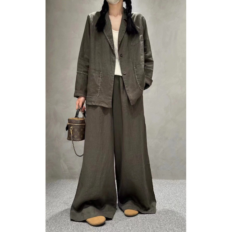 Cz2024夏の新しい女性式開襟カジュアルファッションスーツセット長袖ワイドパンツポケット亜麻