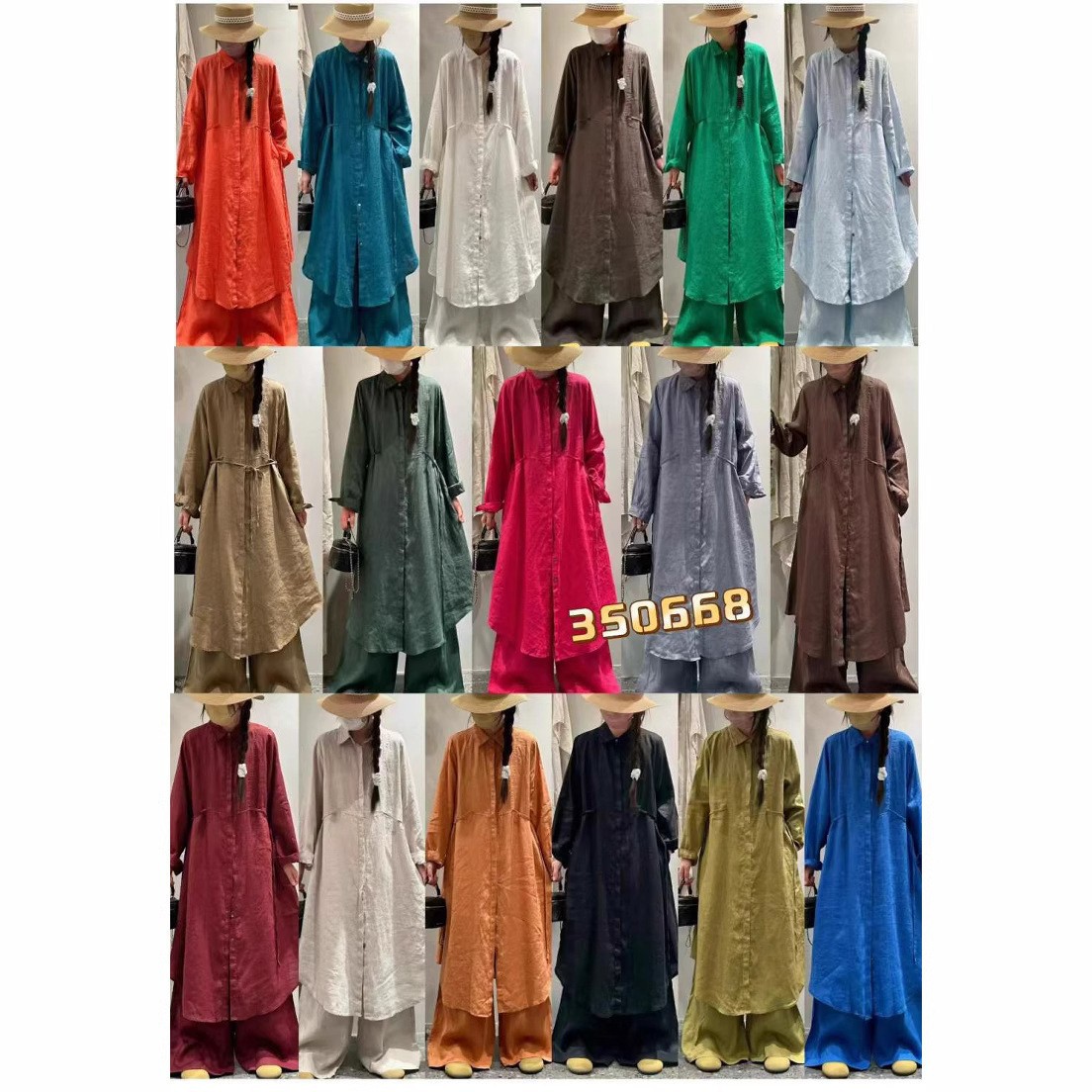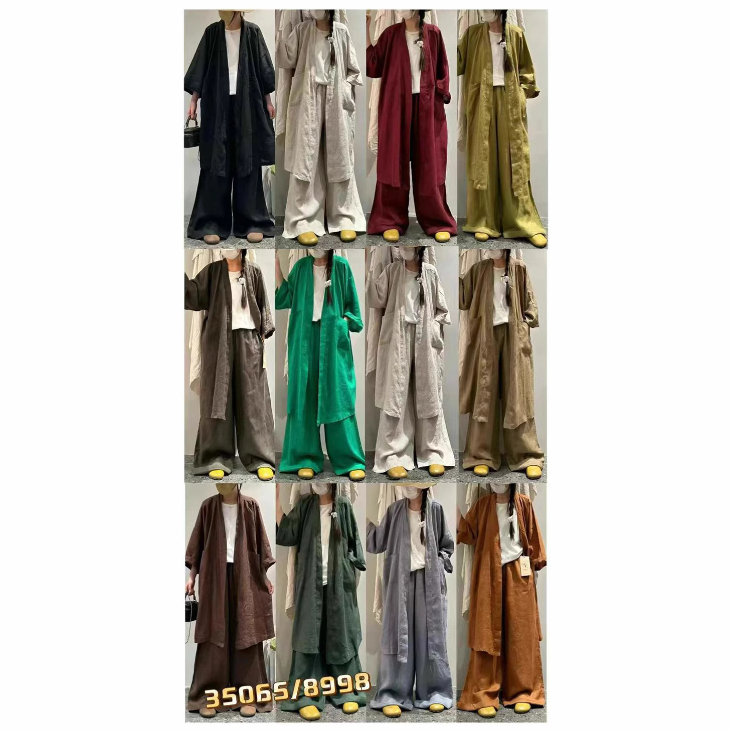 cz35065+8998 リネンルーズレイジーミドル丈カーディガンジャケット+ストレートパンツ新作無地スーツ女性用