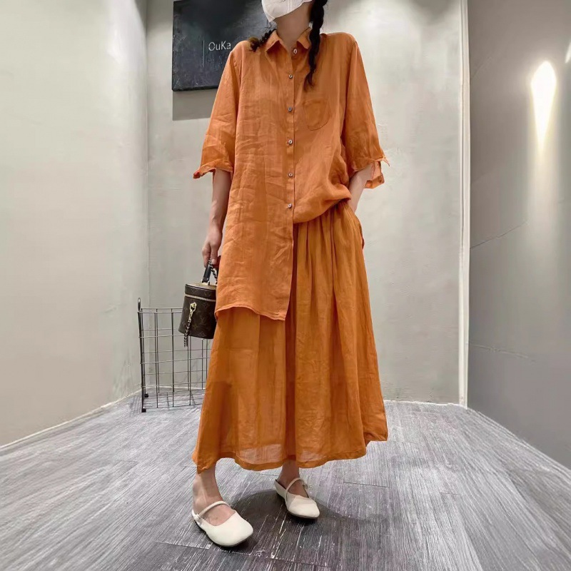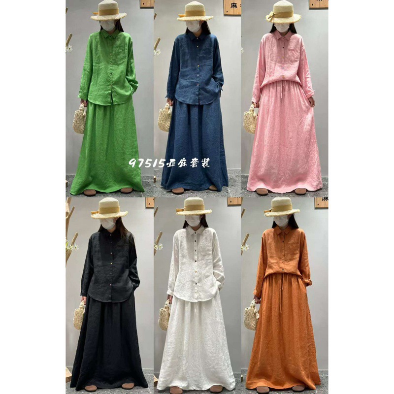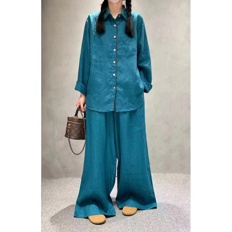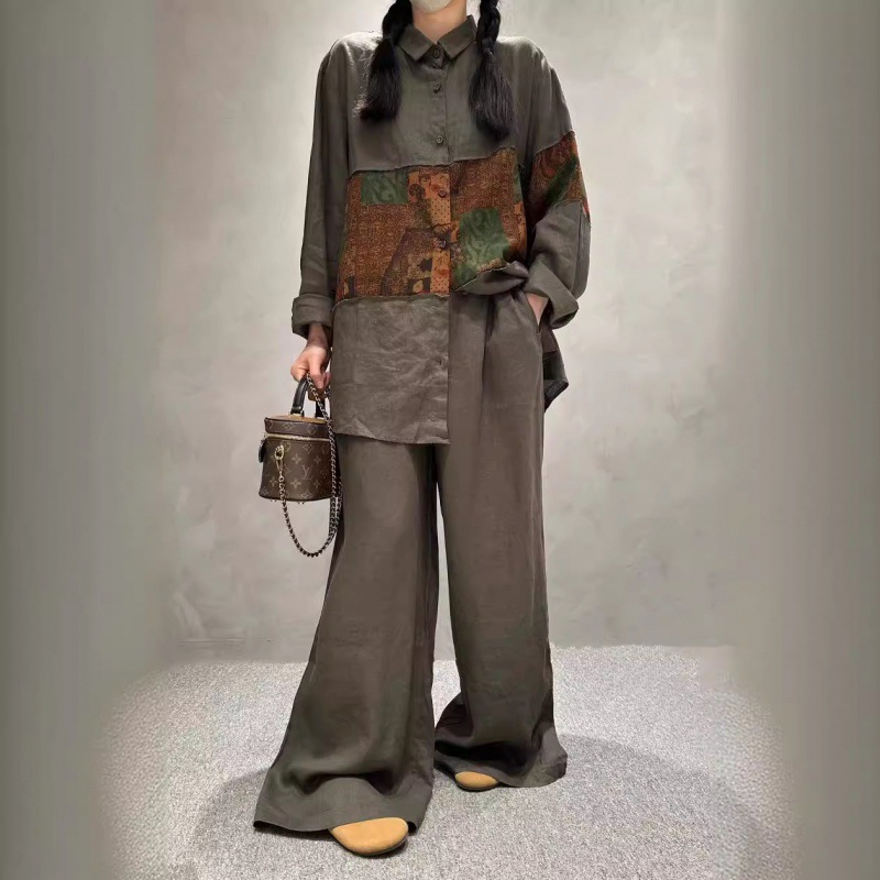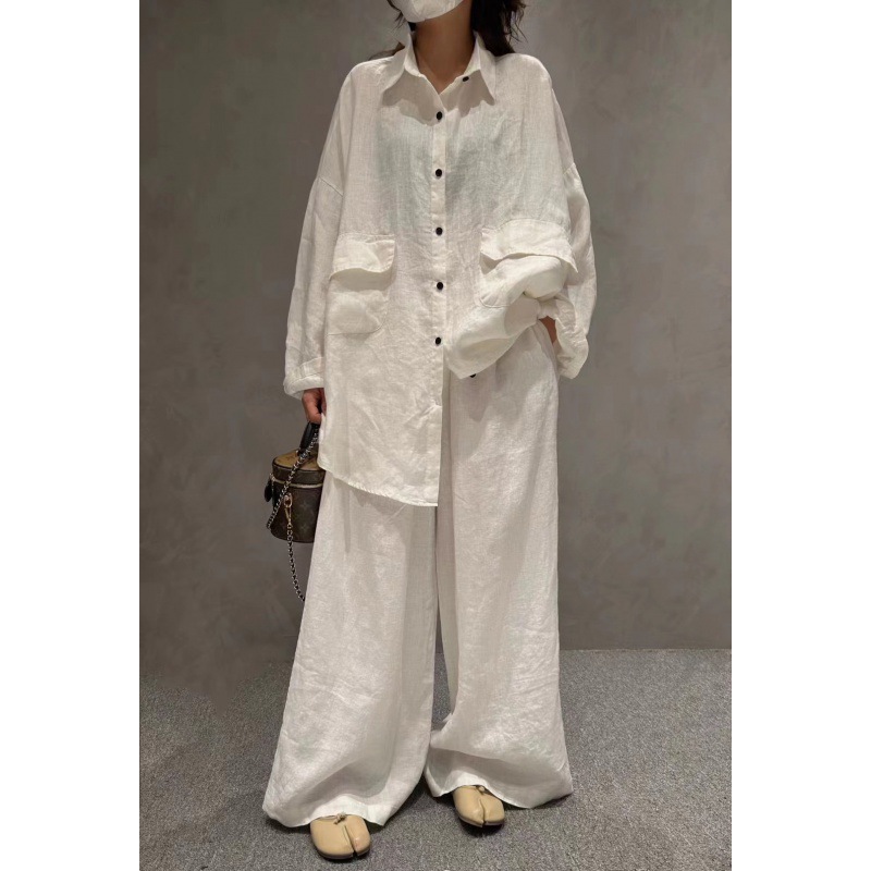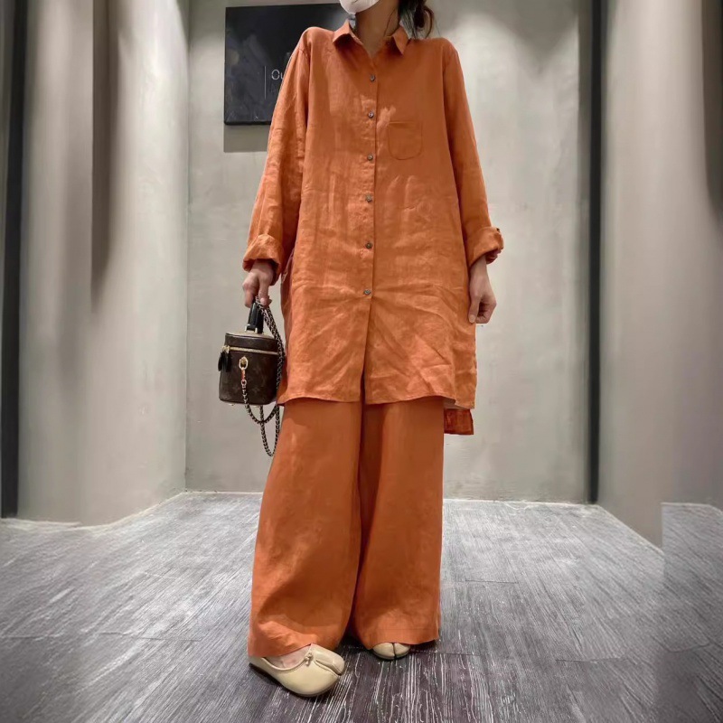 Cz9751純色亜麻ファッション百合ゆるい長袖シャツセット2024新型文芸レジャー2点セット
