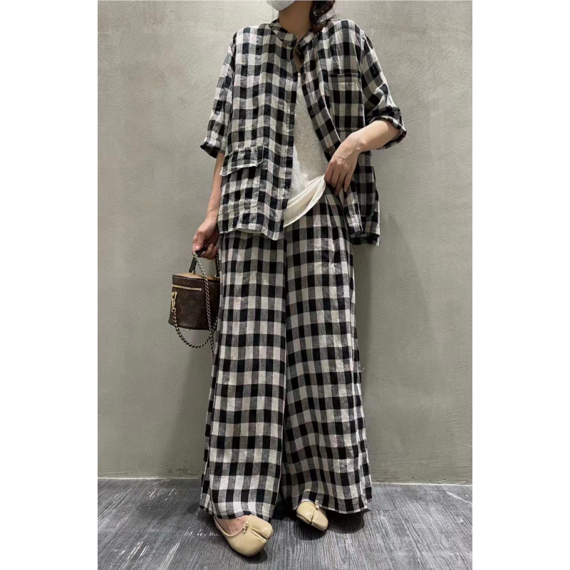 Cz2024夏の新しい女性の格子のスーツの日本のゆったりしたベストの高級感の広い足のズボンの綿のズボンのスーツ